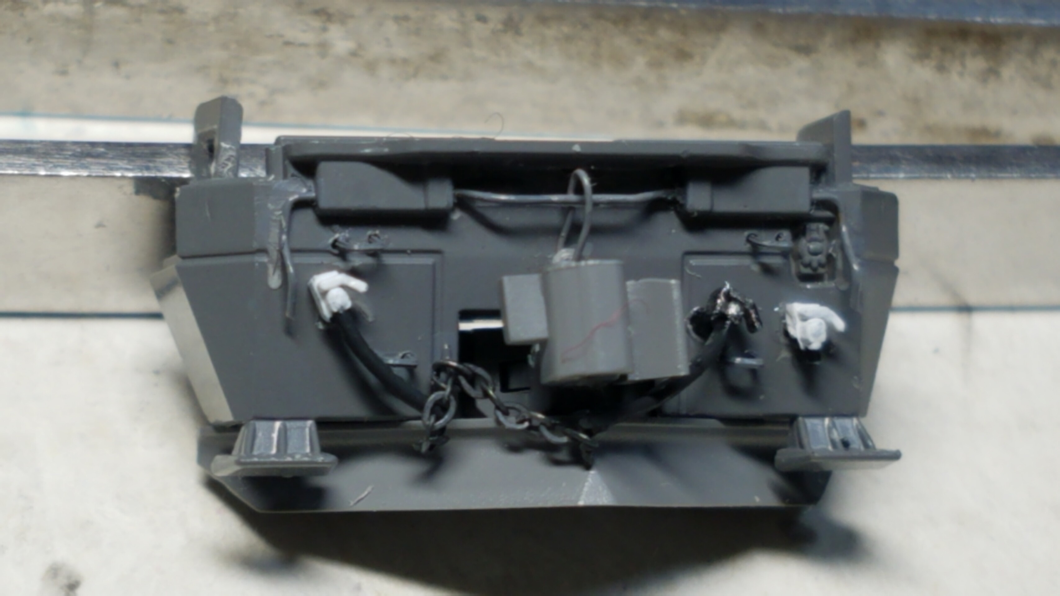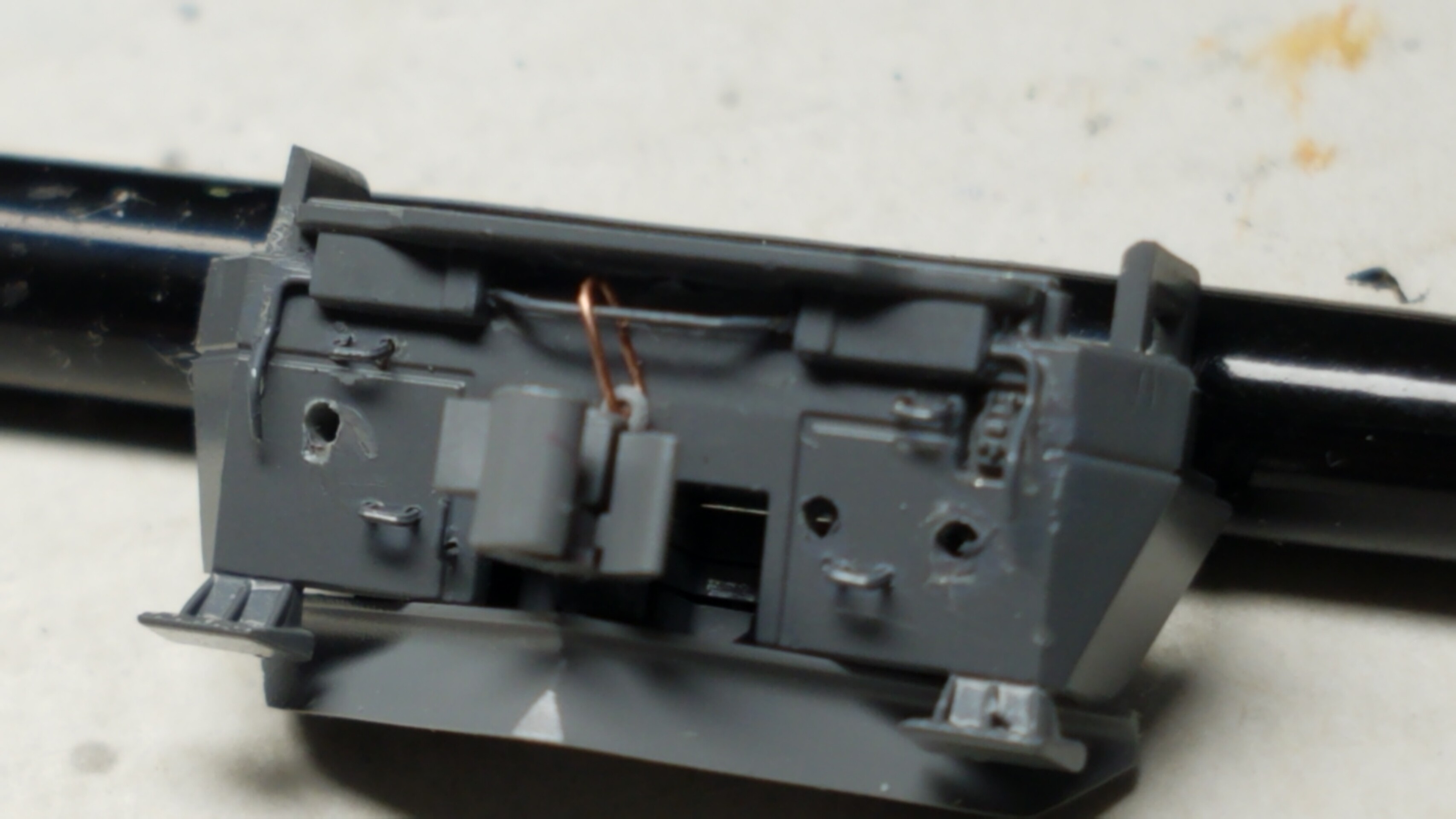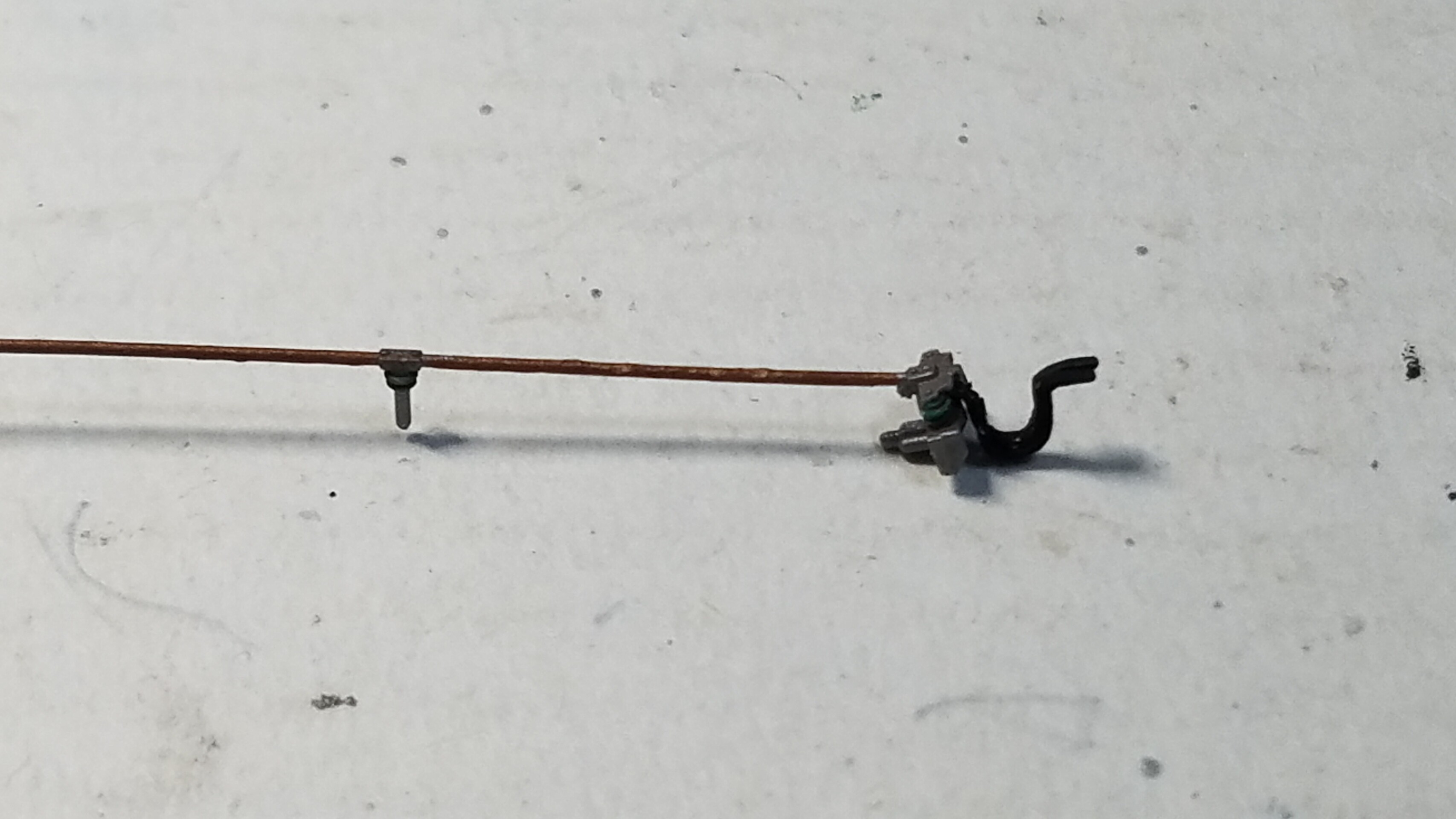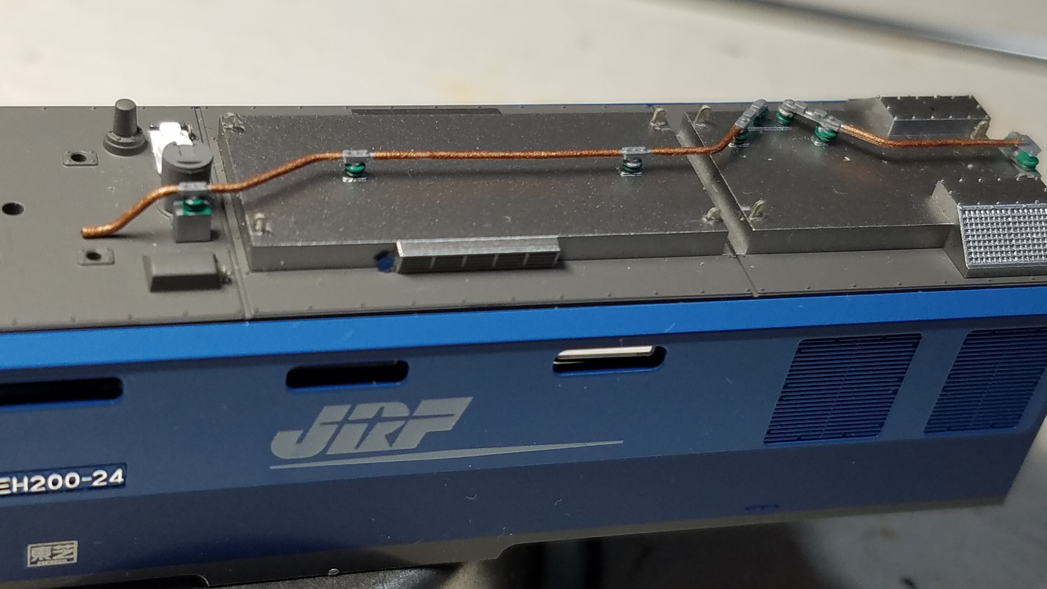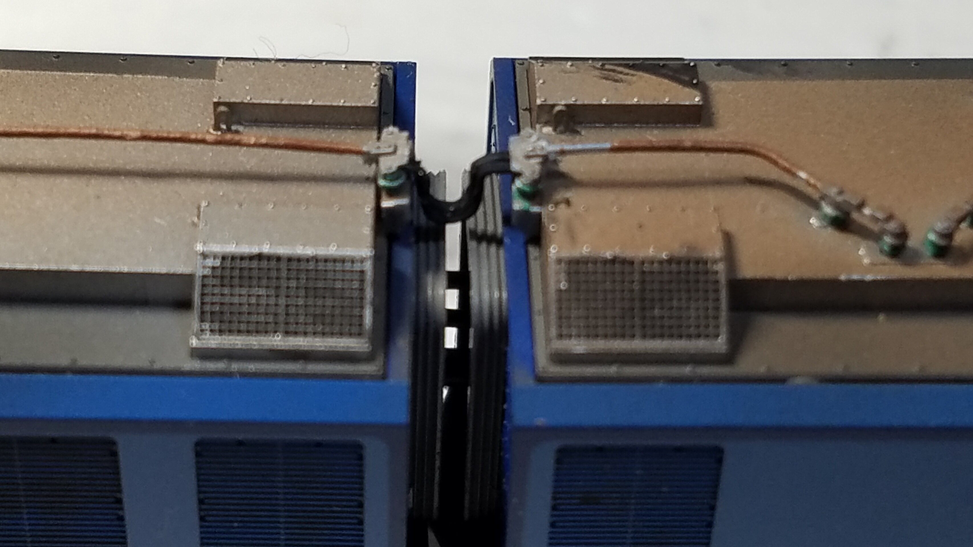 先程真鍮棒で作ったケーブルを今度は4本に束ねタミヤのタイヤブラックに塗装し、屋根上の配管に取り付けます