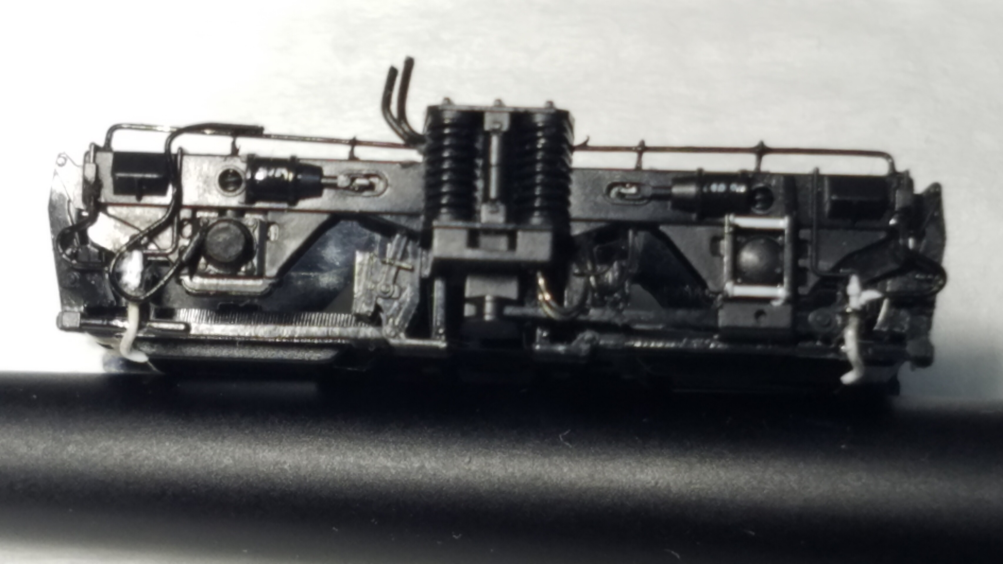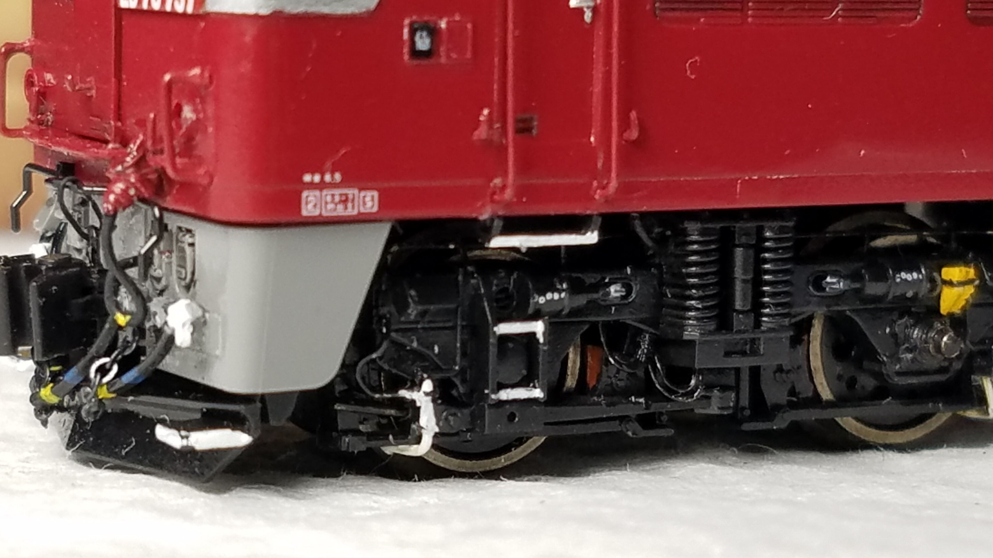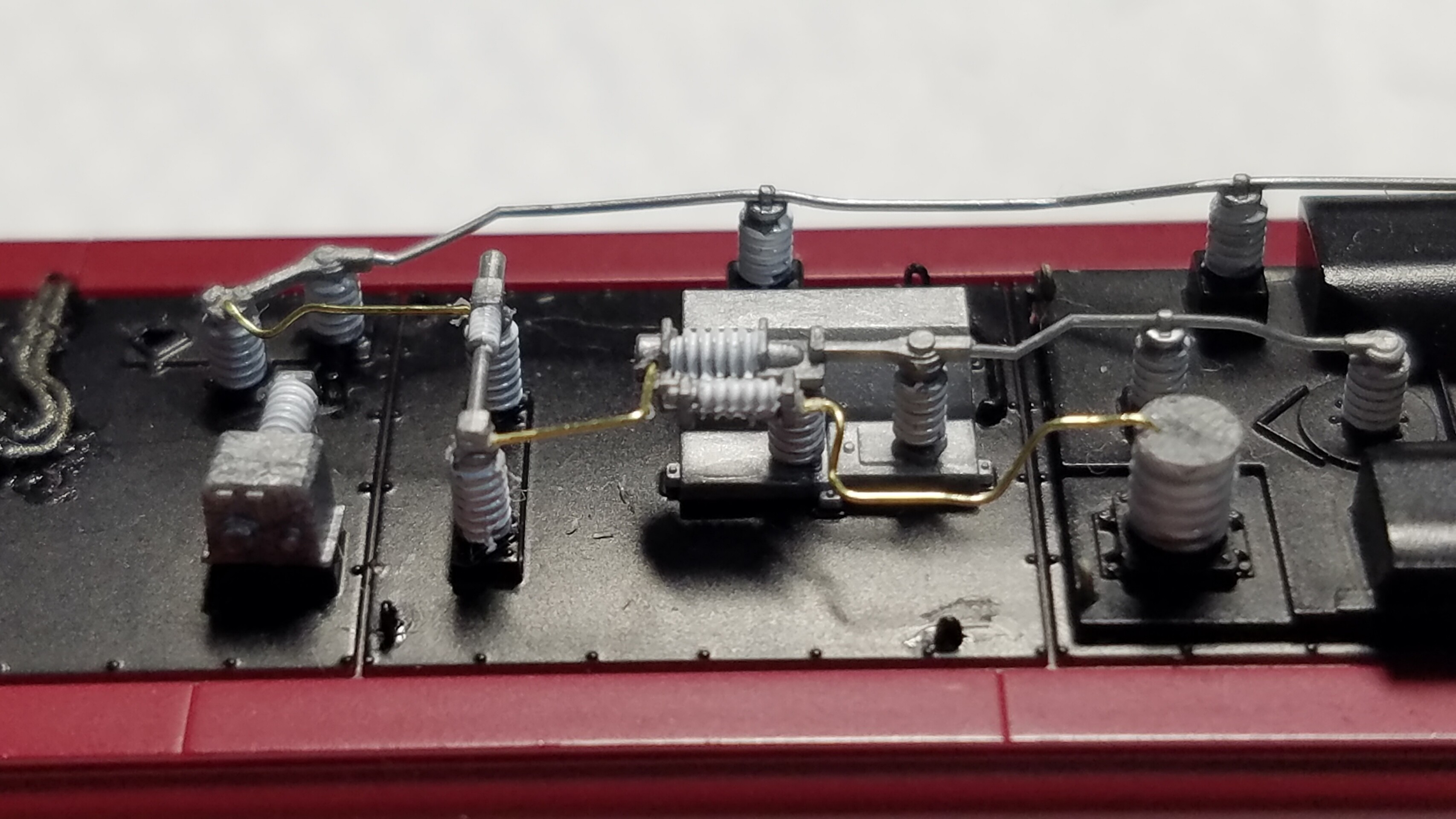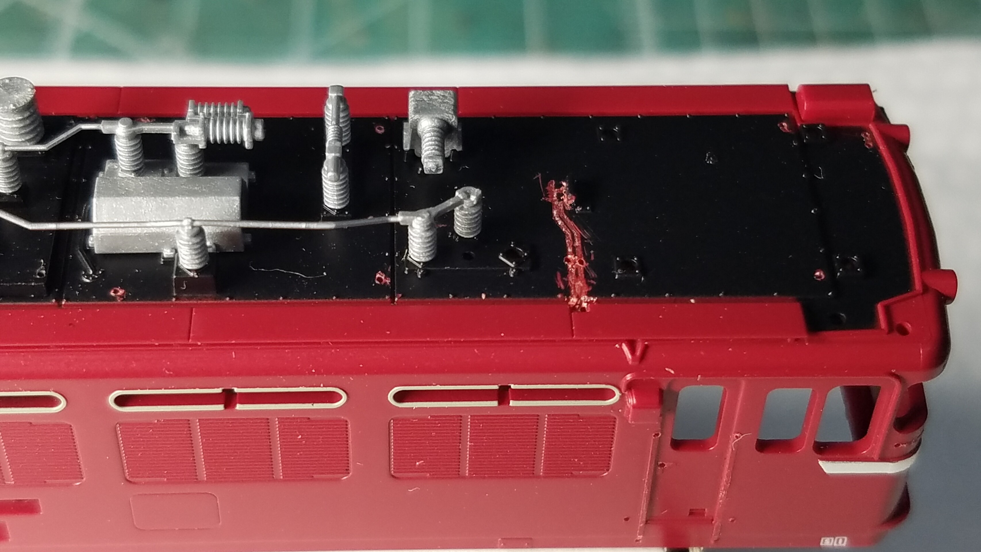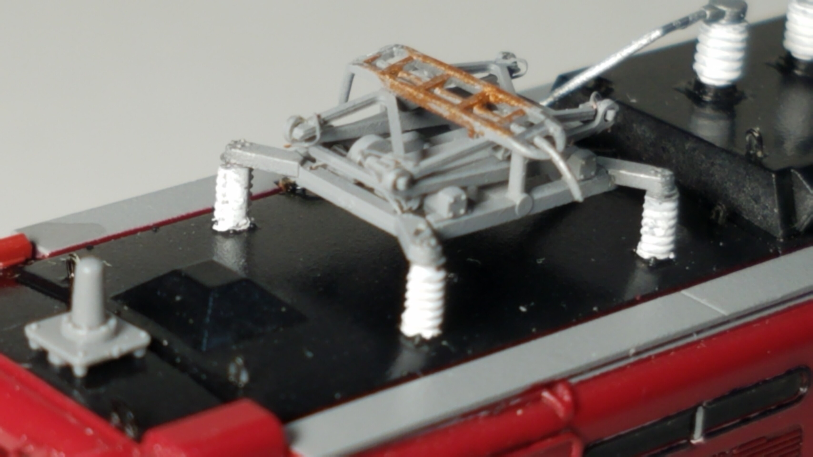 パンタグラフはガイアのマルチプライマーを原液のままエアブラシで吹いて、乾燥後鉄道模型用カラーねずみ色1号で塗装しておきました