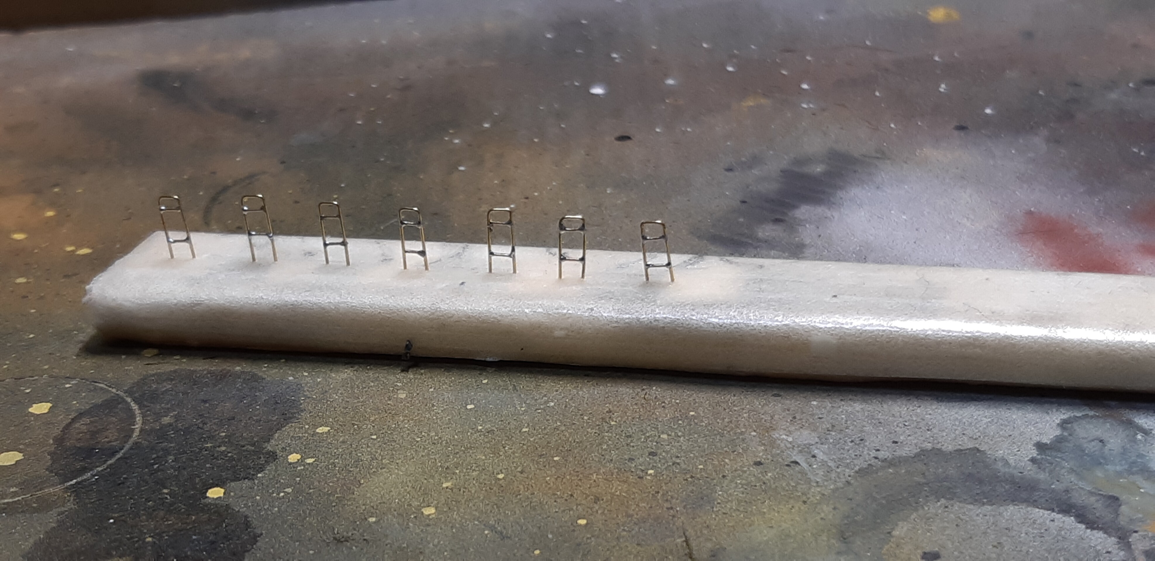 プラ板で柱を2本立てて穴を開け0.2㍉真鍮棒を差し込みます