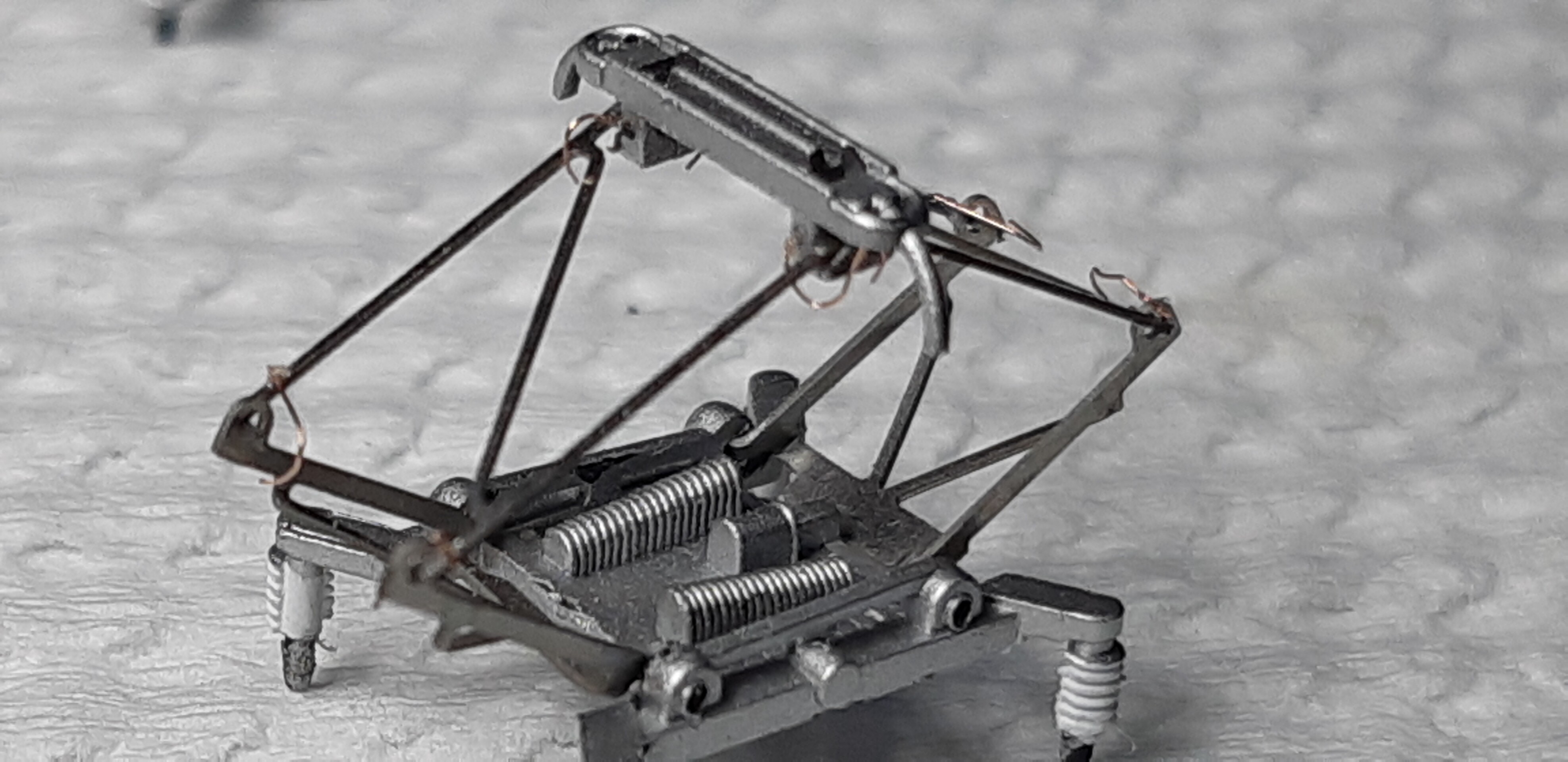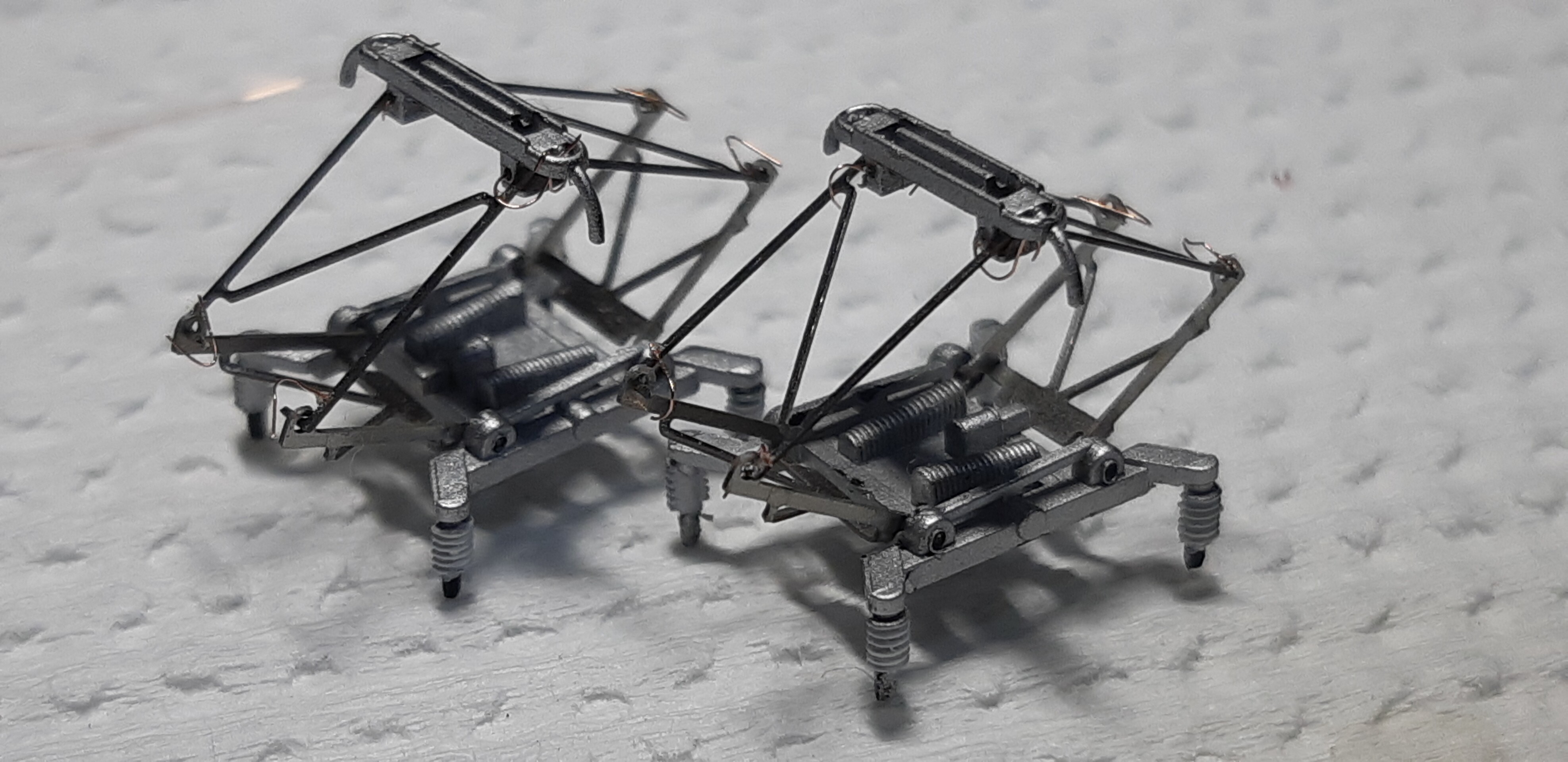 0.08㍉ポリウレタン銅線を使い、パンタグラフの折り目と擦り板の下にコーペルを取り付けます